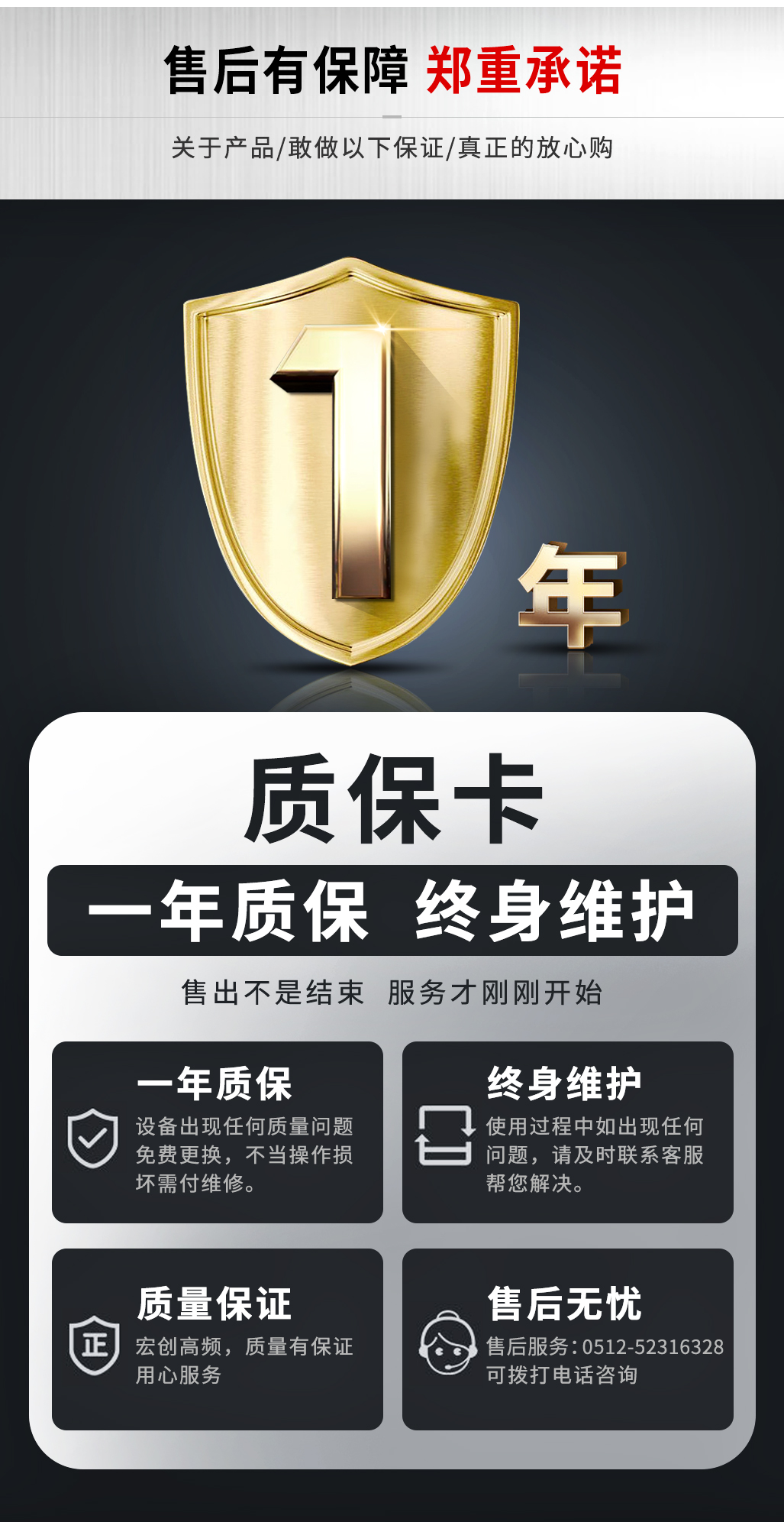 协同服务 service 宏创高频承诺一年质保、终身维保。设立24小时在线客服,响应客户紧急需求,保障客户利益,可提供24小时内上门支持。 宏创高频承诺一年质保、终身维保。设立24小时在线客服,响应客户紧急需求,保障客户利益,技术在线解答疑惑,半小时内给予解决方案,可提供24小时内上门支持。