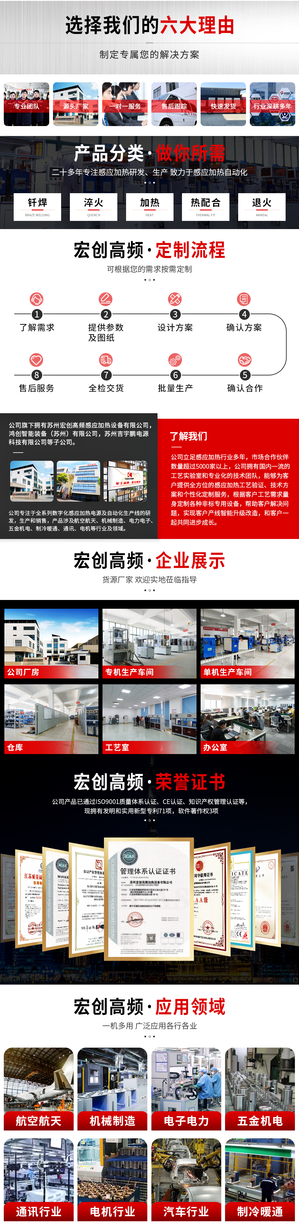 宏创高频投入大量人力、物力重视研发设计,48小时提供自动化感应加热专机解决方案。拥有多名从事加热设备行业10年以上的工程师,且相继获得专利和软著认证30余项。