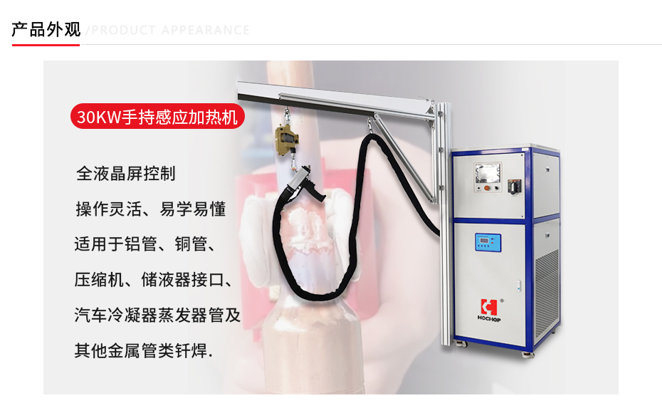 手持式数字感应加热设备具有“移动方便”、“可控性强”、“安静舒适”、“操作精确”和“低成本”等优点,被广泛应用于制冷暖通、家用电器、汽车制造和医疗器械等行业。特别适用于:空调制冷阀件、冰箱冰柜管路件、太阳能配件、压缩机部件、洗衣机(管与管的连接、管与外壳的连接、管与阀门的连接)、汽车蒸发器和压缩机的连接和电动机的短路环等钎焊工艺。