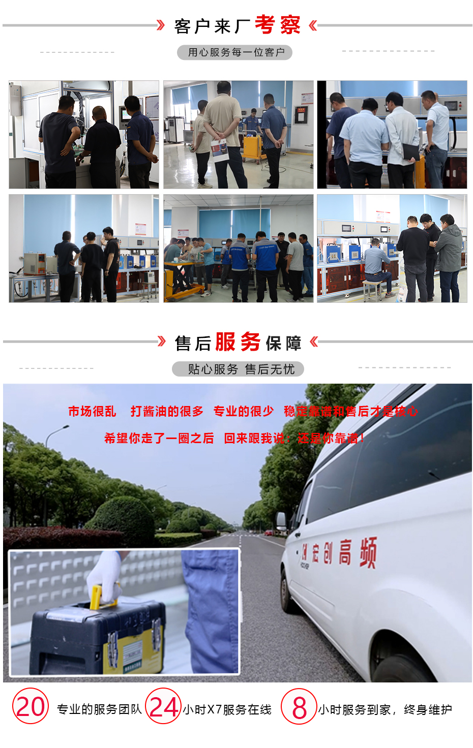 协同服务 service 宏创高频承诺一年质保、终身维保。设立24小时在线客服,响应客户紧急需求,保障客户利益,可提供24小时内上门支持。 宏创高频承诺一年质保、终身维保。设立24小时在线客服,响应客户紧急需求,保障客户利益,技术在线解答疑惑,半小时内给予解决方案,可提供24小时内上门支持。
